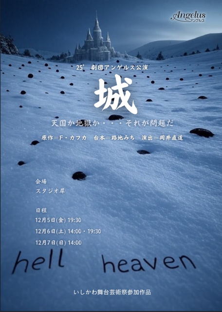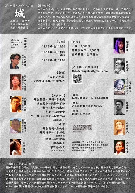 出演=田中祐吉・小野寺里穂・木林純太郎・下條世津子(以上劇団アンゲルス)古林絵美・松井萌華・飯島俊幸・石川雄士(び〜めんぷろじぇくと・チャーリーズスタジオ)酒井隆典・山田勝文・みちゆき 【staff】 舞台監督・照明=本庄亮 ギター=垣田堂 演奏=山田のぶ、林龍之介、原碧 制作=木林純太郎 舞台美術=岸桃子 舞踏指導=松本拓也(金沢舞踏館) 映像=嬉野智裕、岡谷陽光、宇野ゆめ太(劇団ともだおれ)